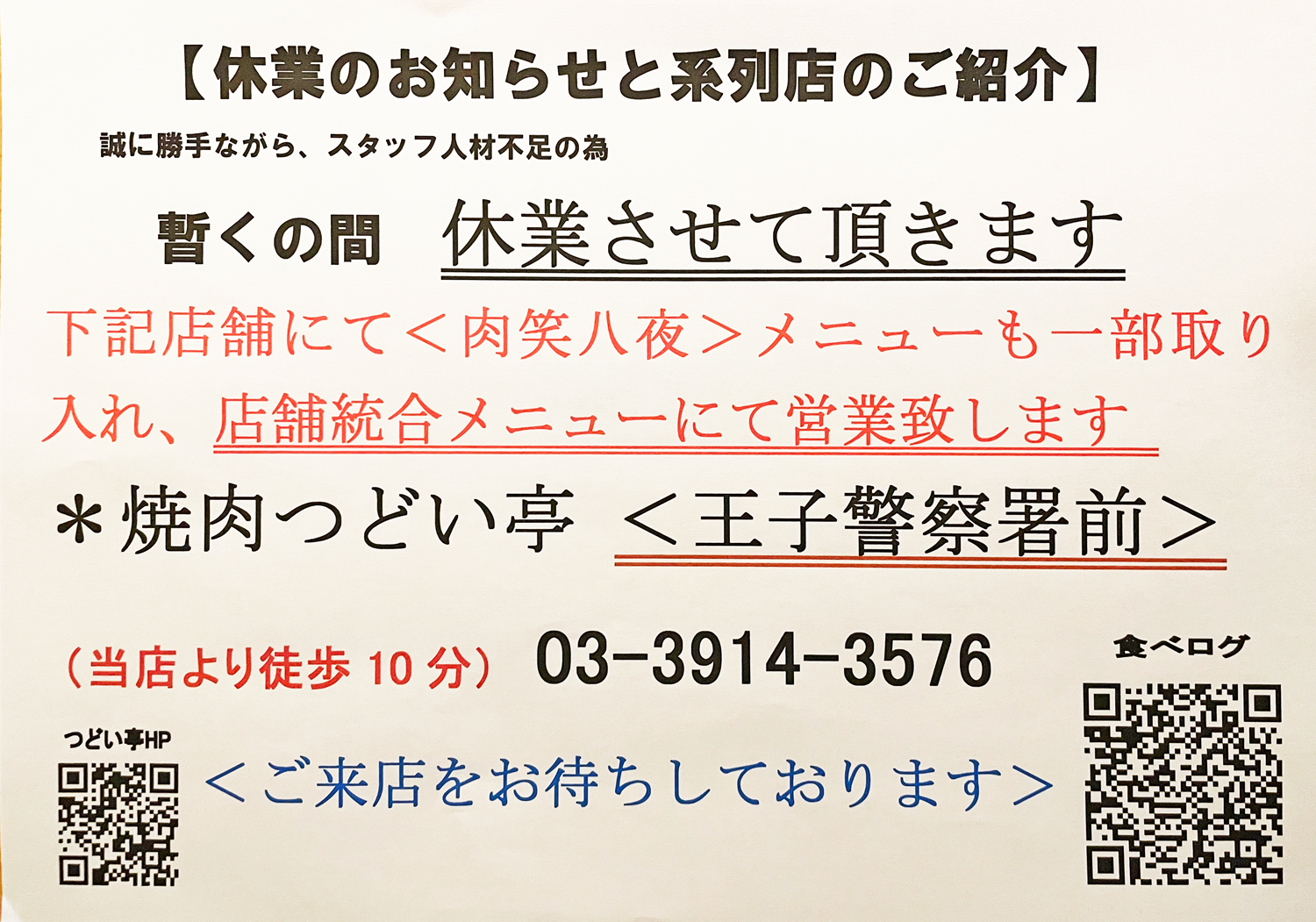 北区王子1丁目 肉笑八夜 お問合せ、ご予約は 03-5944-6088まで TOP グランドメニュー アクセス メニューは予告なく変更になる場合があります。 王子1丁目 『肉笑八夜』 【住所】:〒114-0002 東京都北区王子1-25-8 【電話】: 03-5944-6088 最寄り駅:京浜東北線王子駅北口 営業時間 <17:00~22:15> (食材が終了次第、閉店の場合あり)